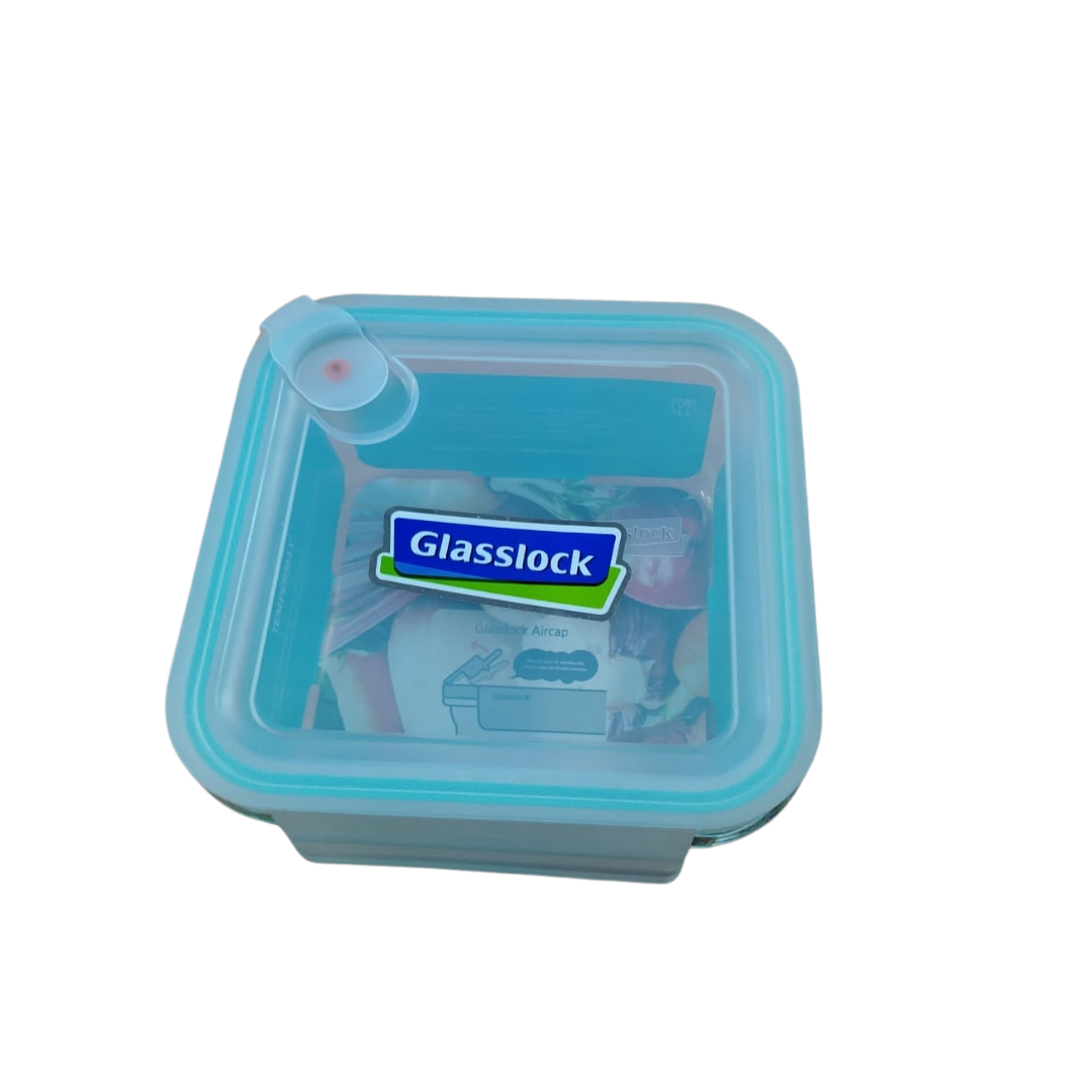Contenedor cuadrado de vidrio templado resistente a golpes térmicos, medidas 160 x 160 x 69 mm. Capacidad de contener 1200 ml.