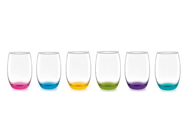 Set de 6 vasos modelo Mikonos de 460 cc de capacidad, con los fondos de colores, ideal para tus preparaciones más veraniegas, tus reuniones familiares, de amigos o simplemente para que disfrutes en tu hogar de tus brebajes más clásicos.