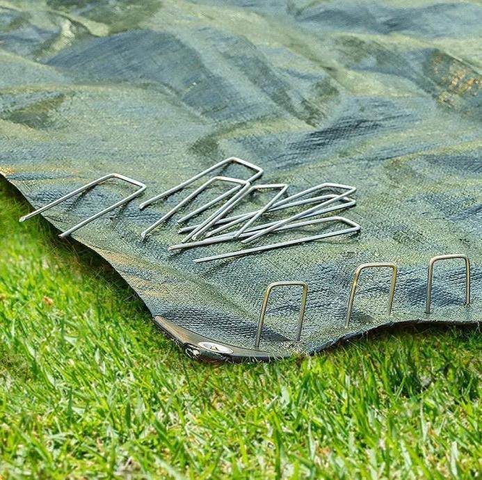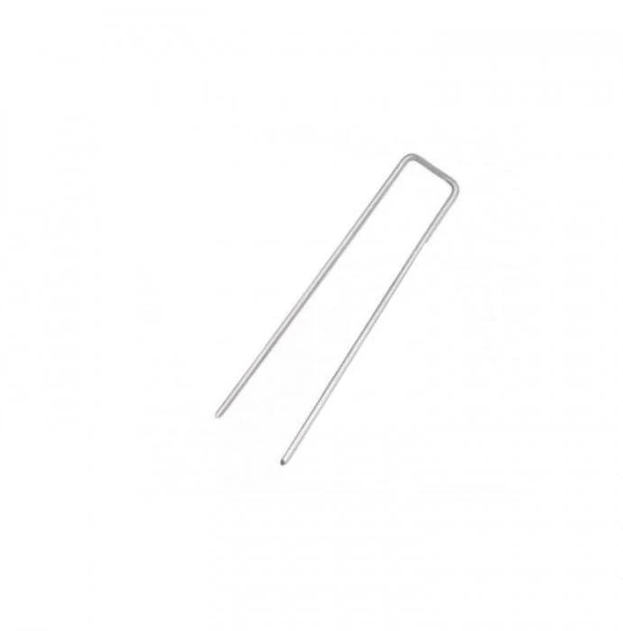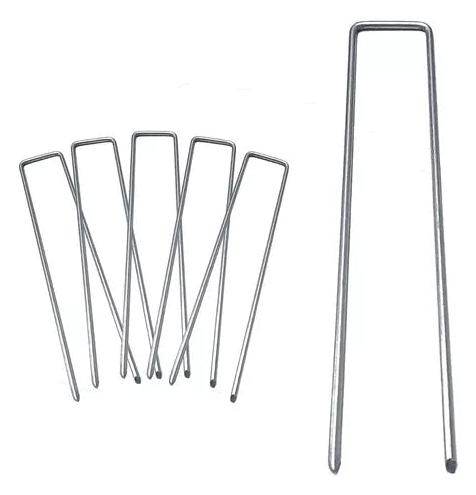 Set de 10 estacas metálicas en forma de U para fijar mallas, plásticos o césped sintético. Resistentes, fáciles de clavar y diseñadas para durar al aire libre.