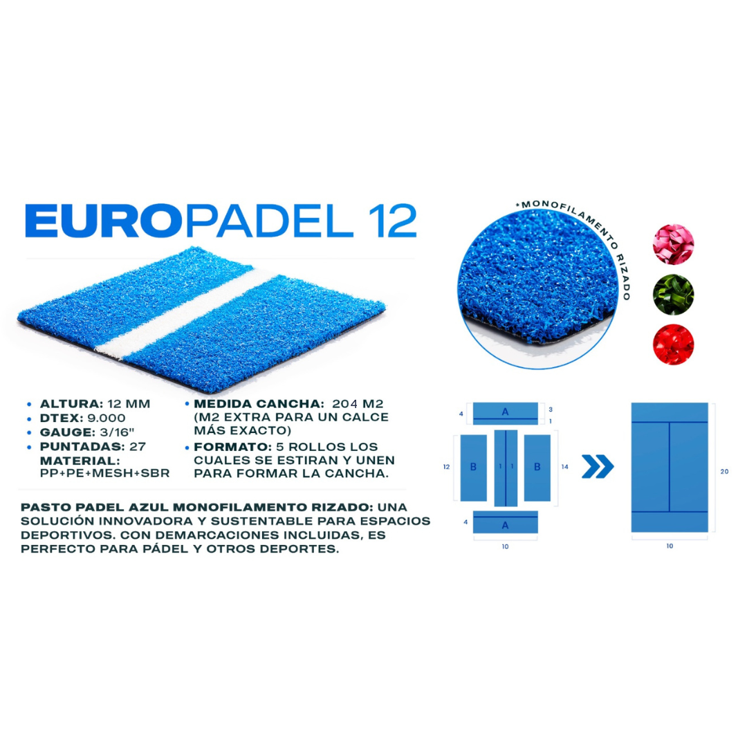 CONJUNTO DE 5 ROLLOS PASTO PADEL AZUL MONOFILAMENTO RIZADO: UNA SOLUCIÓN INNOVADORA Y SUSTENTABLE PARA ESPACIOS DEPORTIVOS. CON DEMARCACIONES INCLUIDAS, ES PERFECTO PRA PADEL Y OTROS DEPORTES.