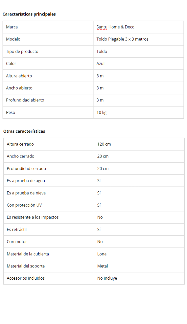 Características principales Toldo plegable es una carpa de un tamaño de 3 metros de ancho por 3 metros de largo. Ideal para salidas familiares al aire libre para estacionar tu auto debajo, para ferias artesanales y todo uso que puedas imaginar. Diseñado en poliéster, protege de la luz del sol, del calor e incluso de la humedad que pueda existir en el ambiente. Gracias a su dimensión es posible acomodar el juego de comedor y disfrutar de los mejores platillos en el jardín y la naturaleza. ¿Cómo y donde usar? – Ideal para el jardín o para salidas al aire libre. – Es fácil de llevar, ya que su peso es liviano y puede ser manipulado por una sola persona cómodamente. – A considerar: – Largo: 3 mt – Ancho: 3 mt Incluye: -Lona de una pieza. -Fierros para montar la estructura cilíndricas. NOTA: (NO ABRIR CON CORTANTE YA QUE SE DAÑA EL PRODUCTO)